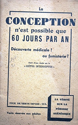 This book La conception n'est possible que 60 jours par an. Découverte médicale ou fumisterie? La vérité sur la période agénésique. Suivi d'une étude sur le coïtus interruptus. 1938. Broché. 32 pages. Papier bruni. (Contraception, Méthode Ogino, Conception) you must read.