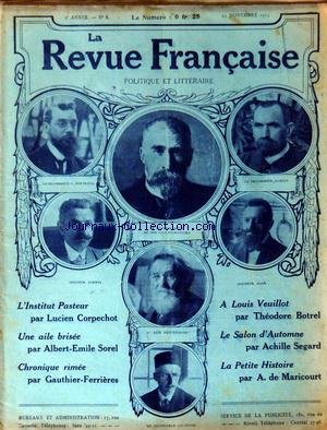 REVUE FRANCAISE (LA) [No 8] du 23/11/1913 - L'INSTITUT PASTEUR PAR CORPECHOT - UNE AILE BRISEE PAR SOREL - CHRONIQUE RIMEE PAR GAUTHIER-FERRIERES - A LOUIS VEUILLOT PAR BOTREL - LE SALON D'AUTOMNE PAR SEGARD - LA PETITE HISTOIRE PAR DE MARICOURT PDF Online